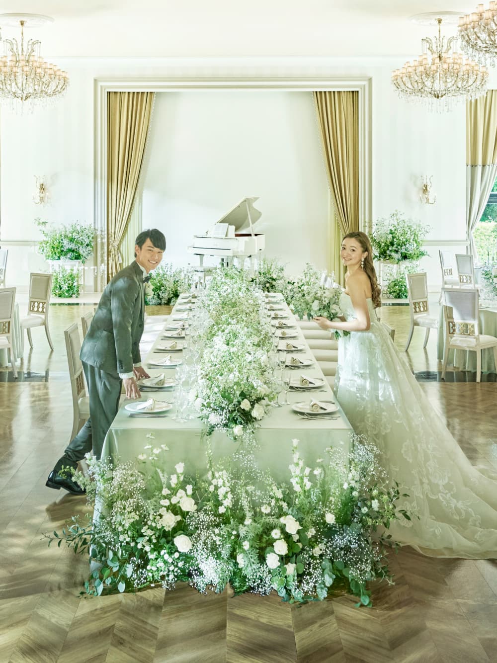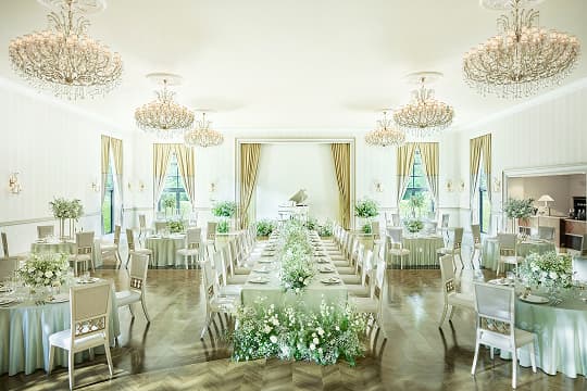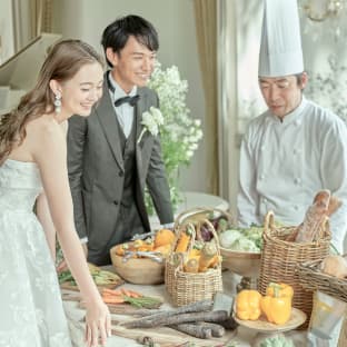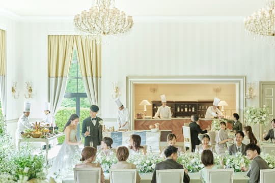 160名が着席できる広々としたバンケットは、どんなコーディネートも映える落ち着いた色調が魅力。おふたりの好みに合わせた自由なスタイリングや、大スクリーンに映像を映し出す迫力の演出、テラス付きのリビングを使ったデザートビュッフェなど動きのあるおもてなしが叶えられます。会話の弾む、くつろぎに満ちた一日をお過ごしください。