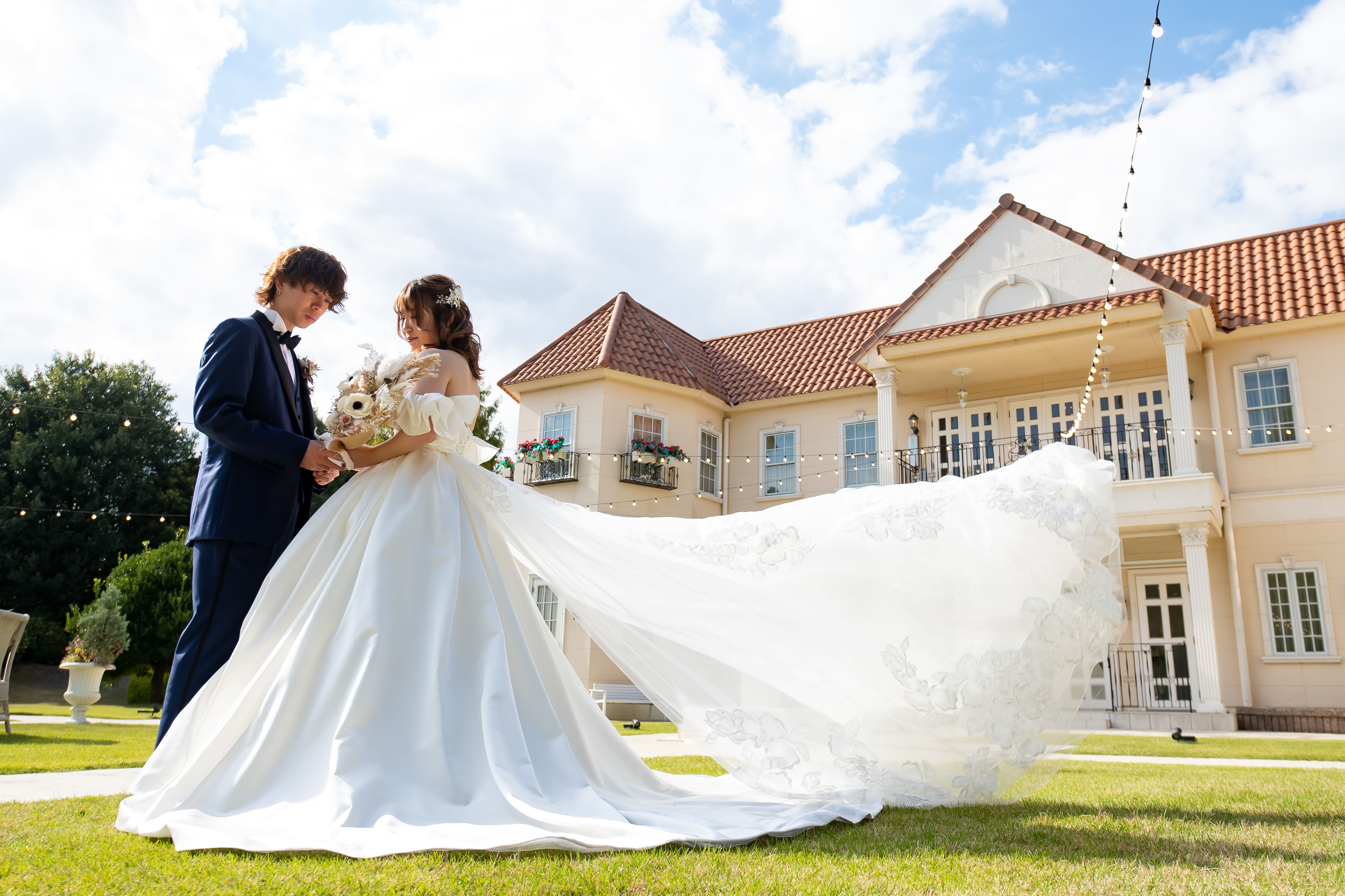 青空×マナーハウス×ガーデンのロケーションはまるで海外の邸宅、非日常的な1枚!