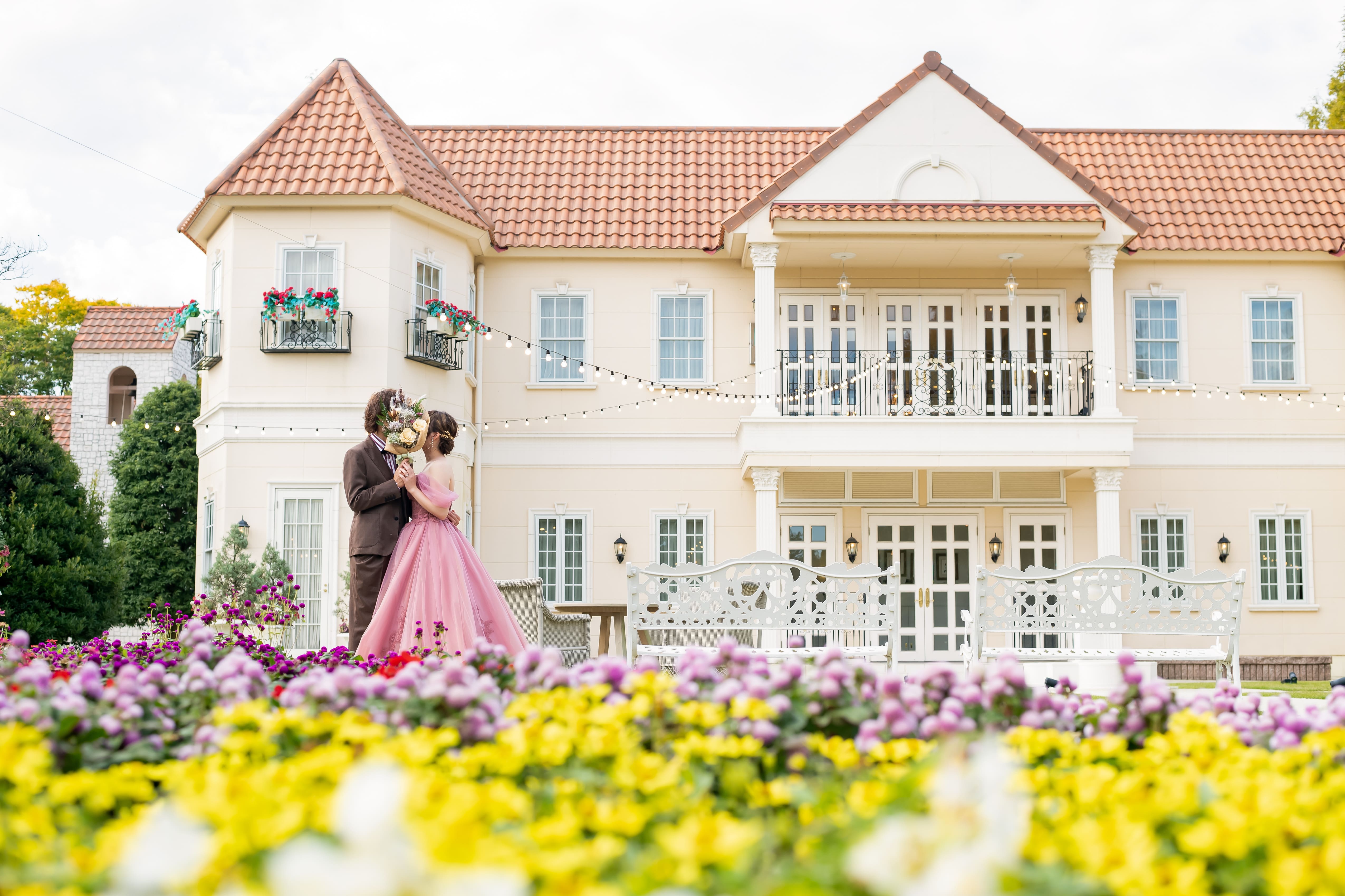 青空×マナーハウス×ガーデンのロケーションはまるで海外の邸宅、非日常的な1枚!