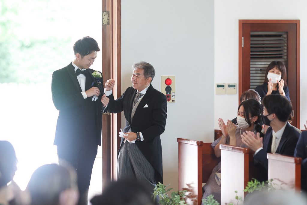さっきまでの緊張が少し和らぎ、証人となるゲストのみなさまに「おめでとう」「頑張れよ!」と見守られながら新郎様が一歩一歩ずつ進みいただき、これから人生をともにする新婦様のご入場をお待ちいただきます。