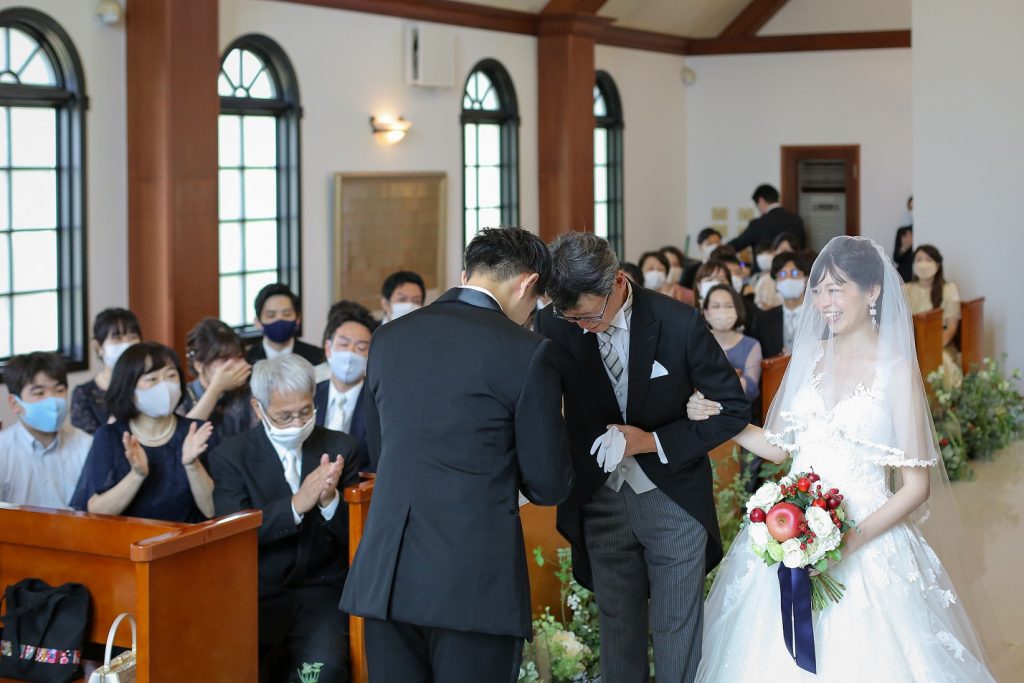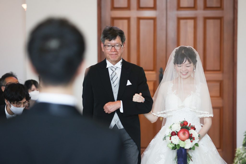 新婦様は人生で一番支えとなった方とご入場し、今までの人生を振り返り、感謝の気持ちを心に持ちながら新郎様のもとへ歩み寄ります。