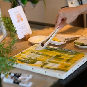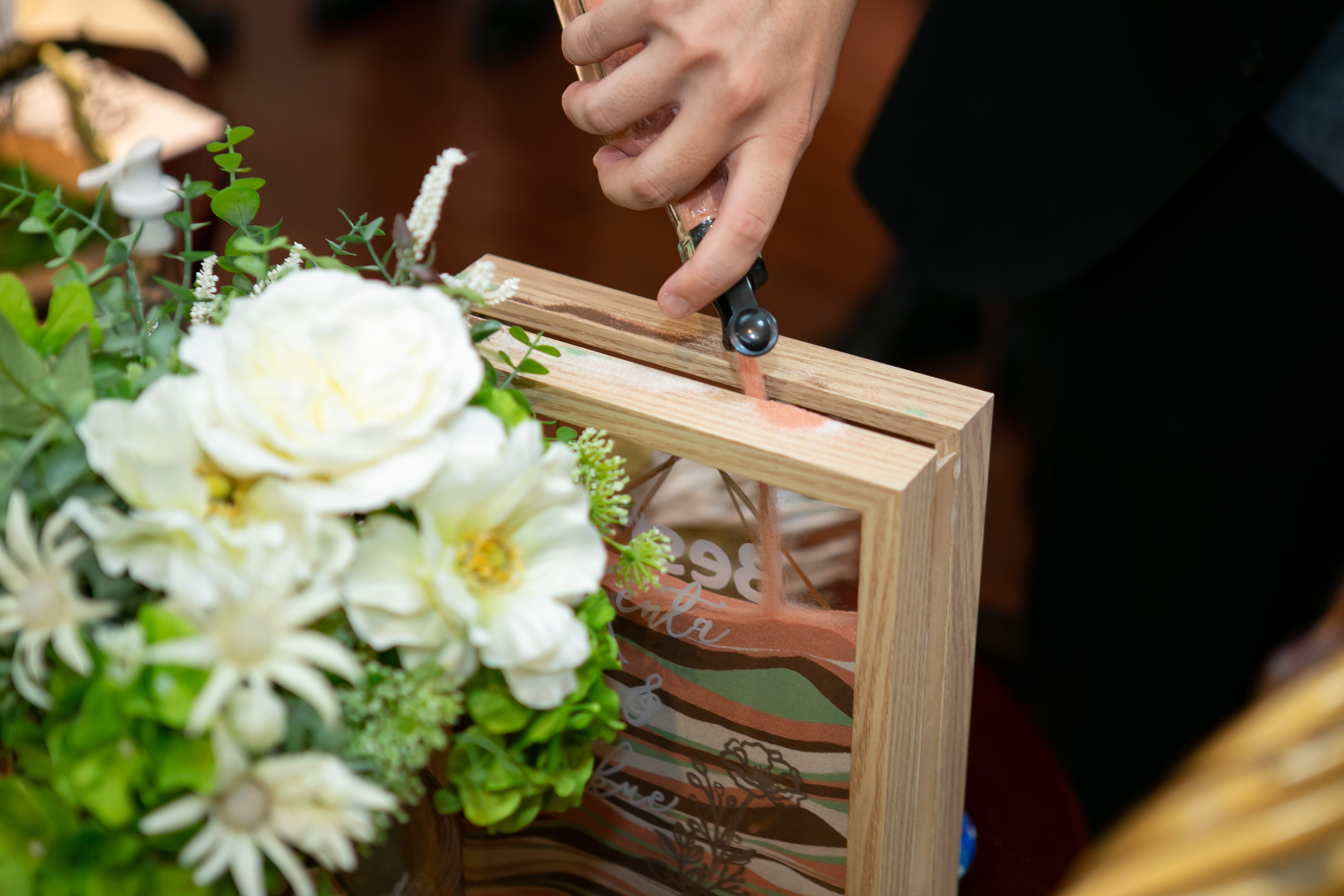 ゲストにお好きな色の絵具を使って、1枚の真っ白なキャンパスに自由に色を塗っていただきます。ゲストによってはちょっと遊びでカーブを入れる方もいたり完成した絵がどんなものになるかおふたりも完成を見るのがすごく楽しみになりますよ!