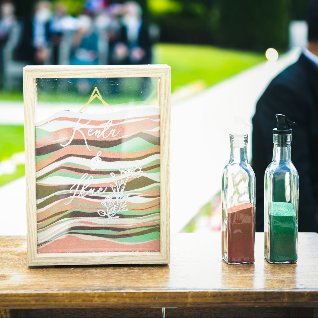 結婚生活において大事だと思う色をゲストに入れていただきゲスト参加型でサンドアートを作成します!ゲストも巻き込んで作り上げる素敵なウェルカムグッズです。ゲスト様によって砂の入れ方や混ざり方、お二人に大切にして頂きたい想い(色)も違う。そんな世界に一つのアイテムです。