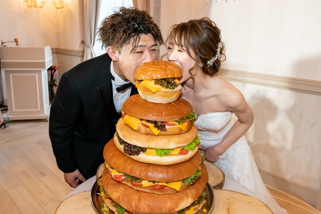 フルーツや生クリームでつくる甘いウエディングケーキも大人気ですがハンバーガーやパンケーキ、お肉ケーキや、お寿司ケーキなどバリエーションも豊富で”おふたりらしい””こんなの見たことない”とゲストの方々もあっ!と驚かれ、小さいお子様から幅広いゲストの方々からも喜ばれます。