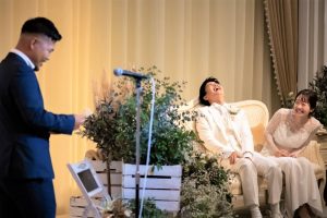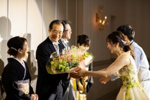 そして、そのような人生を送れたのも、ふたりを愛し尊重し育ててくれた親御様がいたからと語るおふたり。親御様への感謝の想いを手紙と一緒に会場に使われている花に託して届けたいと、かすみ草を花束に入れご用意されました。お手紙につづられる感謝の気持ち。その想いを花束にも乗せて受け取った親御様の表情はとても明るく笑っていらっしゃいました。