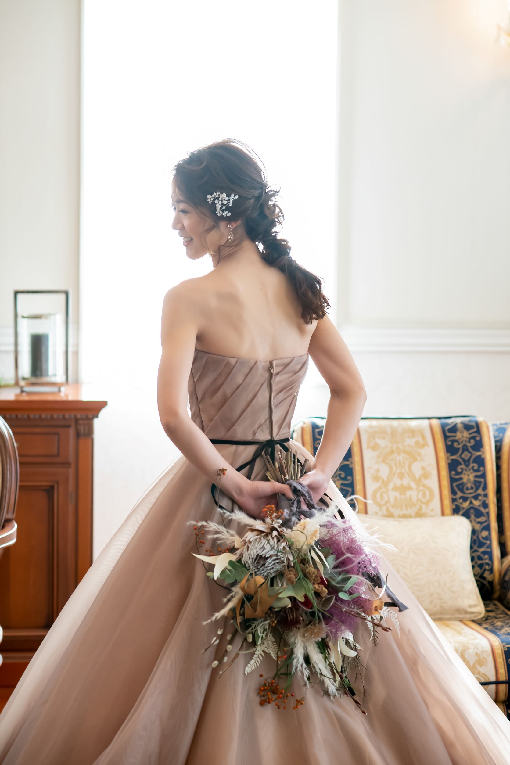 こんな風に、衣裳によってガラッと変わる雰囲気をより素敵にしてくれるのがヘアスタイルなのです。