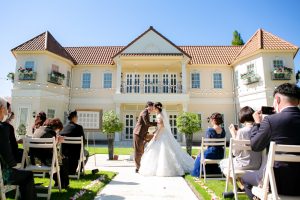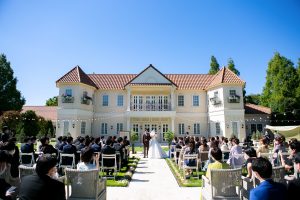 フェアブルームではガーデン挙式と一言で表しても、2か所の場所から挙式場所をお選びいただけます!まずご紹介するのは広大なガーデンで青空を広く感じながら、マナーハウス(正面の建物)をバックに海外風な結婚式を挙げられます。