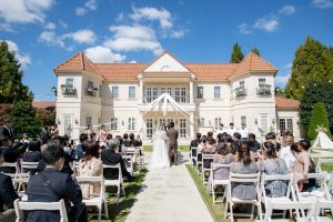 チャペルは距離感の近さを大事にするためこじんまりしているフェアブルームですが、ガーデンでの挙式に人数制限はありません!