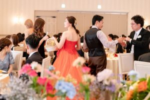その後の披露宴会場でのお時間も、お食事をゆっくり楽しんでいただきたいという想いから、最大160名収容のバンケットで窮屈感のないお時間になりました。
