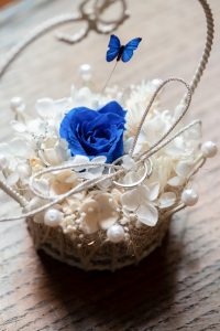 挙式にはリングピローも手作りでお持ちいただき、ここにもブルーのバラと蝶々が舞っています