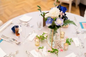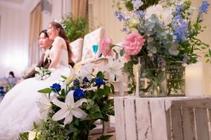 そしておふたりの周りを囲むメインソファ席は、カラフルなお花を小瓶活けにし、その中でもブルーが映えるコーディネートに。