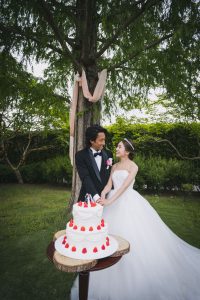 本物の自然をバックにウエディングケーキ入刀のセレモニーは