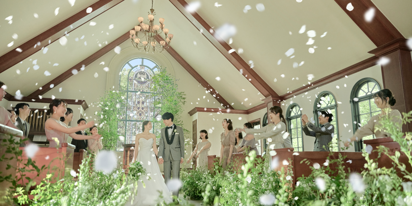 見渡す限りの空と自然に包まれたガーデン、緑に映える外観が愛らしい石積みの独立型チャペル、