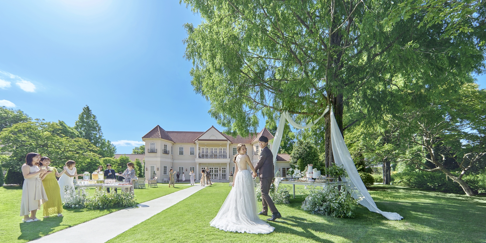 緑あふれる3000坪の敷地に広がる緑あざやかな芝生のガーデンで、ゲストの笑顔と祝福に包まれた最高の一日を。