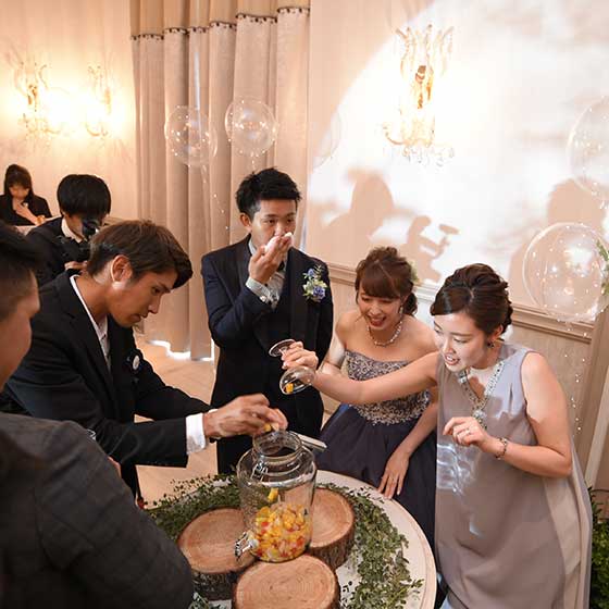 自分たちらしいアットホームな雰囲気の結婚式にしたいと思っていたので、会場の飾り付けやゲスト参加型のイベント演出などたくさんこだわりました。自分たちらしい結婚式にするために、仲の良い友人に立会い人となってもらい、人前式セレモニーを行いました。