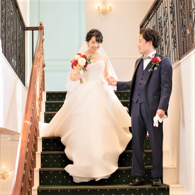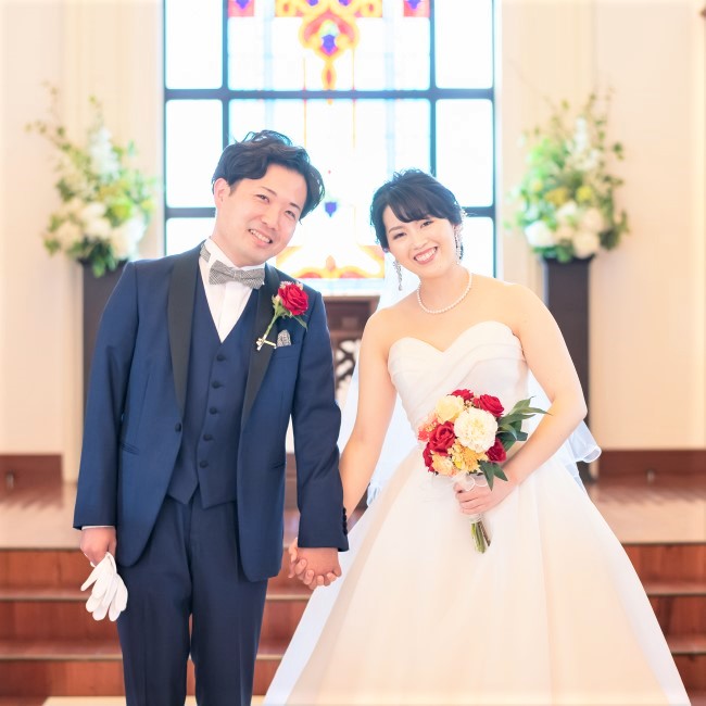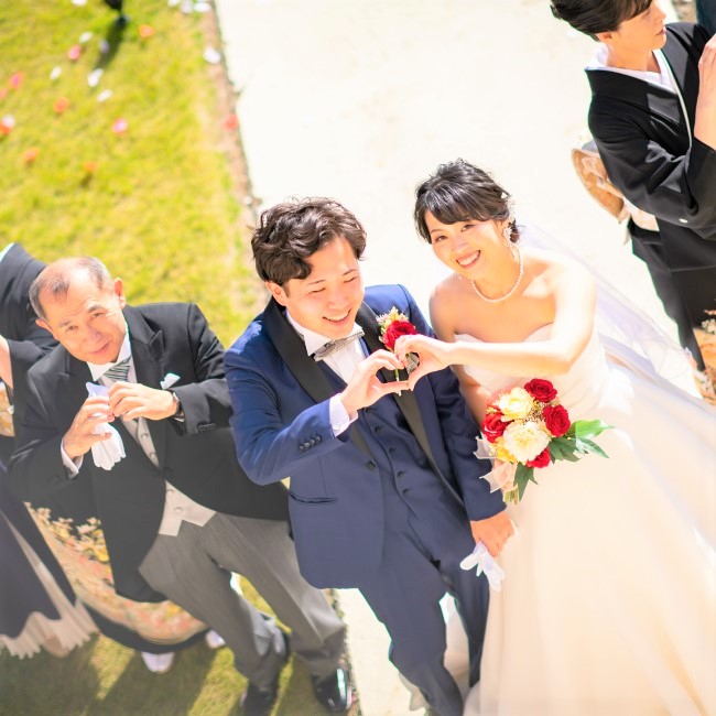 青い空に太陽が眩しく輝く最高の天気に恵まれ、最高に幸せな時間を過ごすことができました。朝7時に両家の親達と一緒に式場入りしました。身支度を整え終えると、少し緊張してきましたが「今日は私たちが主役!楽しもう!いっぱい笑おう!」と2人で言い合い、楽しみながら1日を過ごせてよかったです。お菓子まきやインタビュー等の企画もゲストから楽しかったと言ってもらえて嬉しかったです。写真を撮って、挙式して、次に何をして、これをして…と次から次へと進んであっという間でしたが、スムーズかつ無事に結婚式ができたのは、担当プランナーさんをはじめ、たくさんのスタッフさんたちが私たちのために一生懸命動いてくださったからです。本当にありがとうございました。