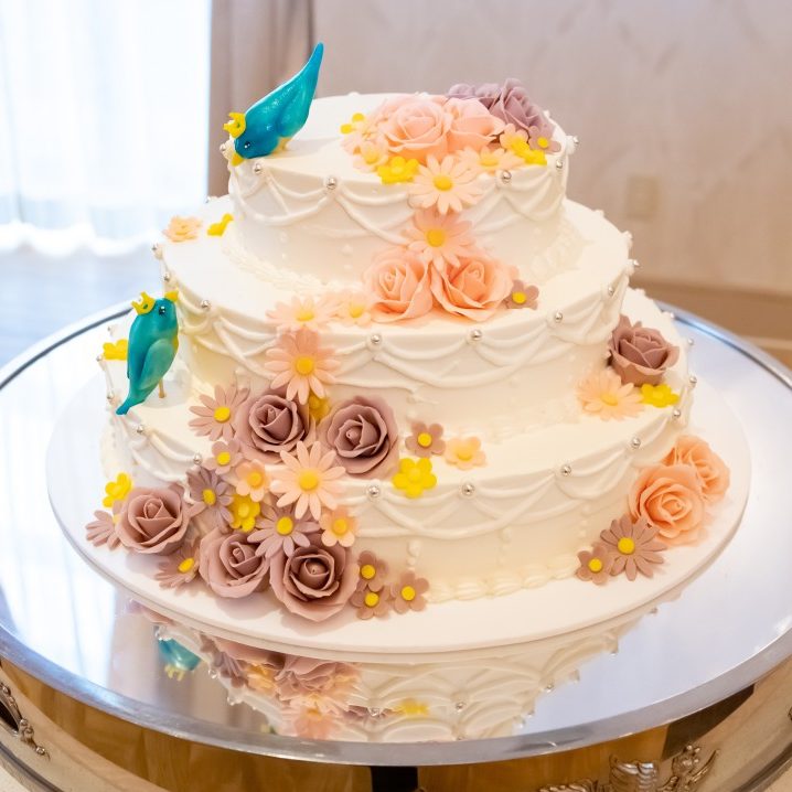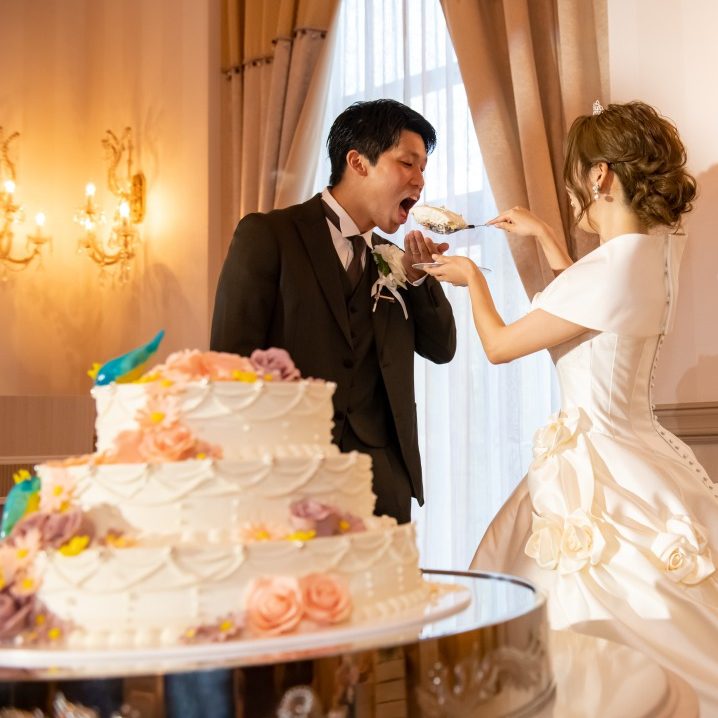 こだわりの青い鳥のウェディングケーキに、ガーデンでのデザートビュッフェのセッティングなど、魔法をかけたかのように私たちの理想が次々と再現されていることに感激し、まるでディズニーランドにいるかのような夢見心地の楽しく幸せな時間となりました。
