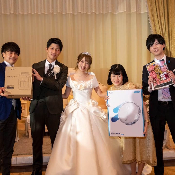 披露宴での余興は、電話番号抽選会というものを行いました。、私たちもゲストも誰にあたるか分からなかったのでドキドキで楽しかったです!当たった方へは私たちから感謝の気持ちを込めて、プレゼントを贈りました。