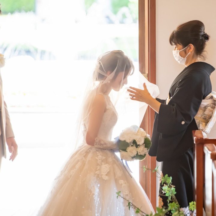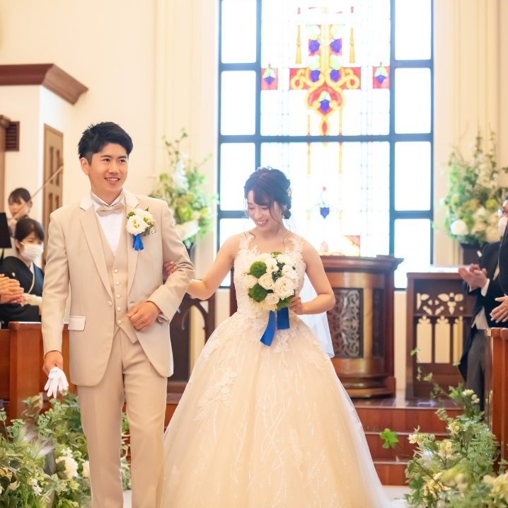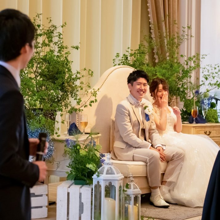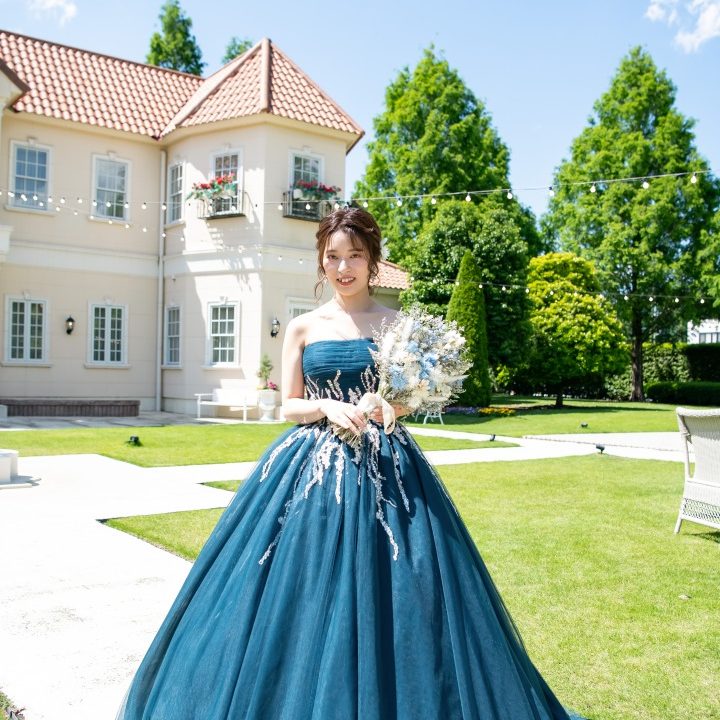 ウェディングドレス用ブーケのリボンも青を取り入れたり、ソファ高砂席でもグリーン×ブルー…例を挙げると沢山ありますが、色で作る雰囲気にこだわりがありました。