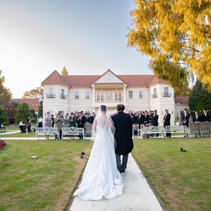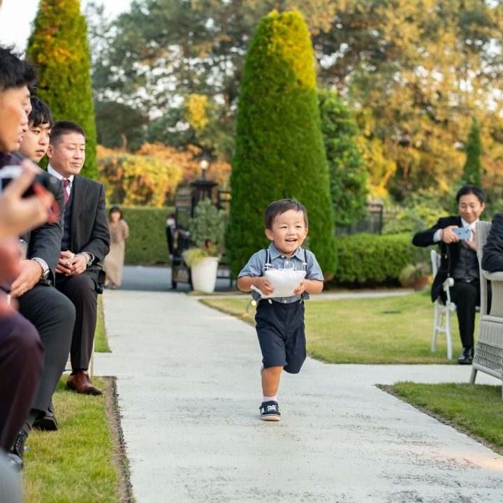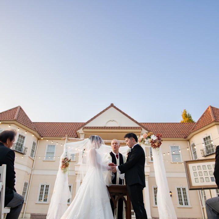 式当日は、新郎が靴を忘れるというハプニングから始まり、あれよあれよという間に挙式を迎えました。夏日になるほどの晴天にも恵まれ、家族や友人、牧師さんに見守られながら、無事にガーデンでの挙式を終えました。