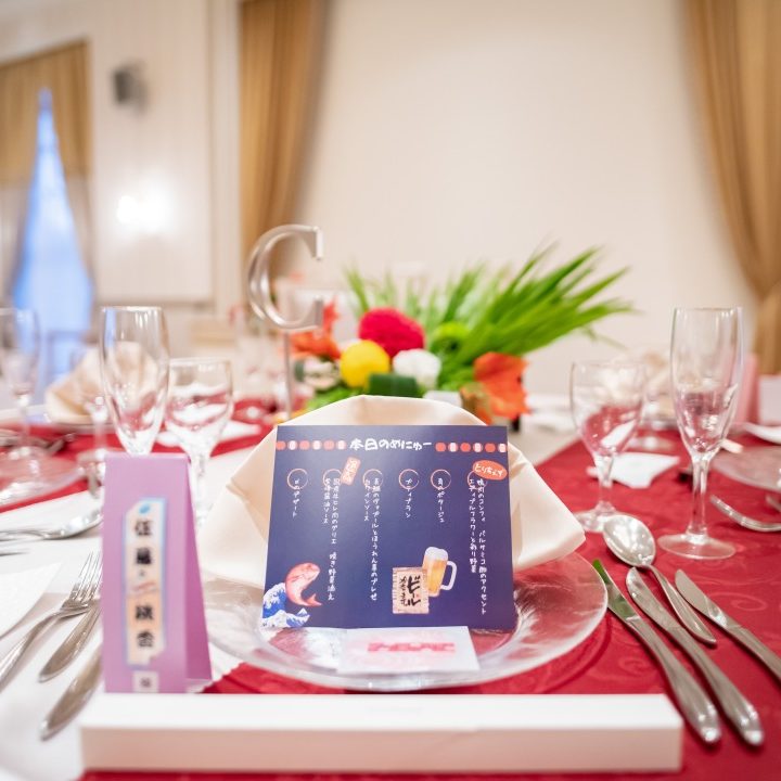 家族へ、そしてお世話になった方々や友人にも感謝を伝えたいという想いから、結婚式のテーマは「秋の大感謝祭」に決めました。披露宴会場を「お祭り」の雰囲気にすべく、会場の装飾やペーパーアイテム、BGMや料理にはとことんこだわりました!