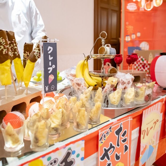 また、ブッフェでは、料理長の粋なはからいで、唐揚げや焼きそば、たこ焼き風のシュークリームなど、お祭りらしい料理を出すことができました。さらに最後には、花火を上げる演出も準備しました。