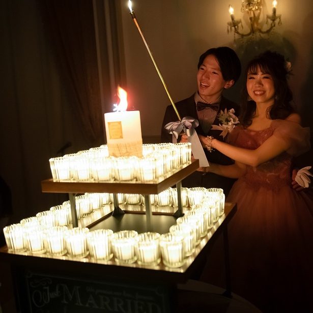 ウェルカムスペースをクリスマス仕様にしたり、会場装花も赤と緑色を取り入れたり、キャンドルを灯したり、、