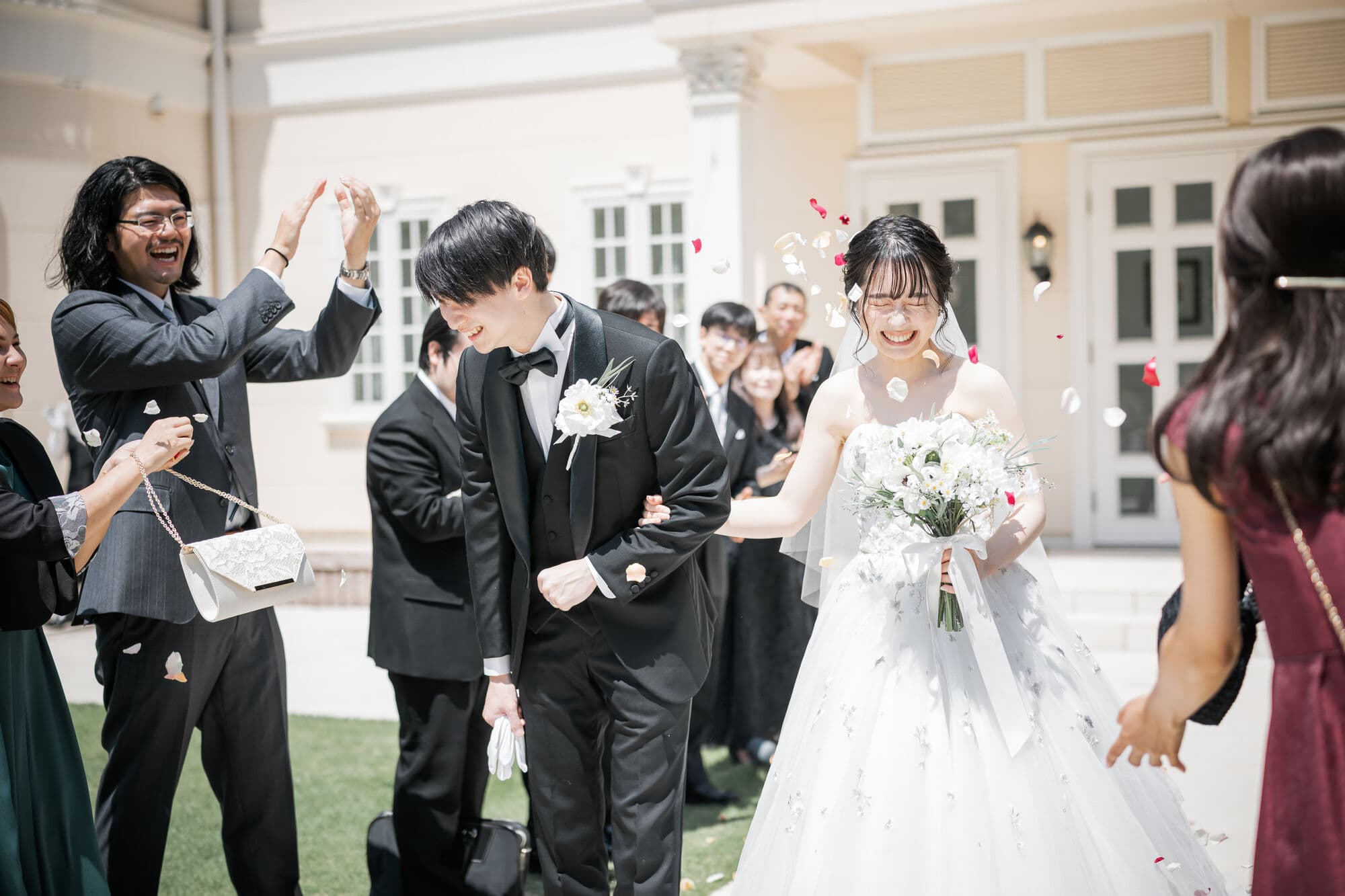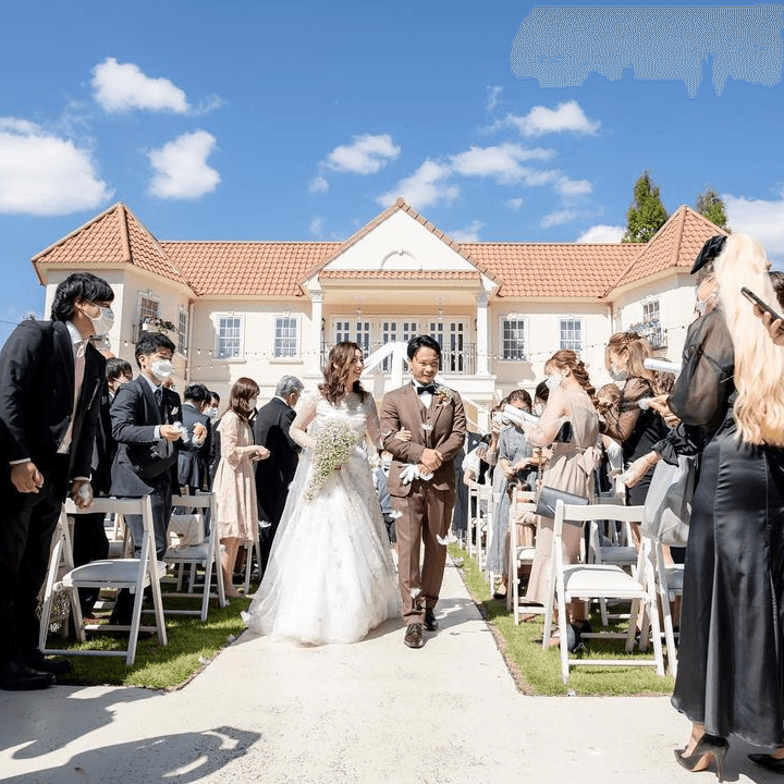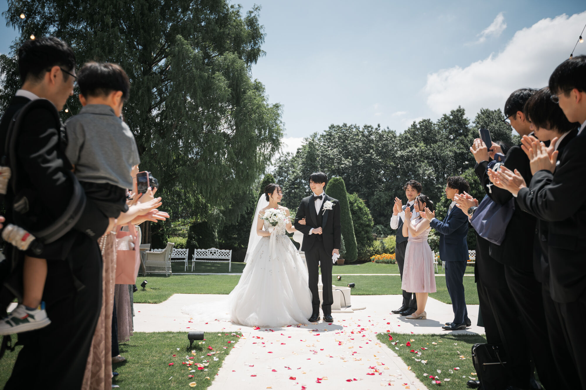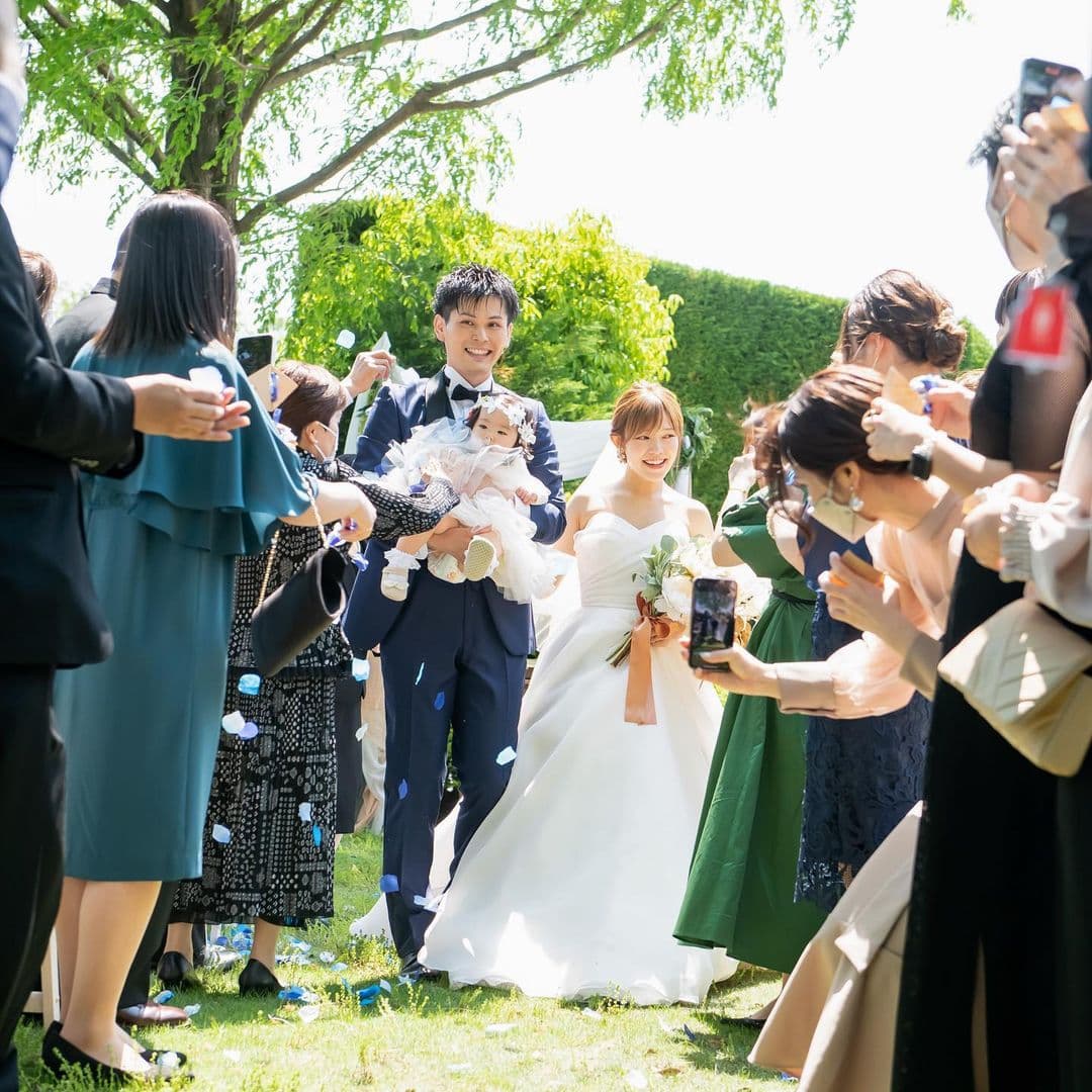 アフターセレモニーでは、夏の鮮やかな青空と草木の緑に囲まれたガーデンで、色とりどりの花びらが舞い、ゲストの皆様から温かな祝福の言葉が贈られました。