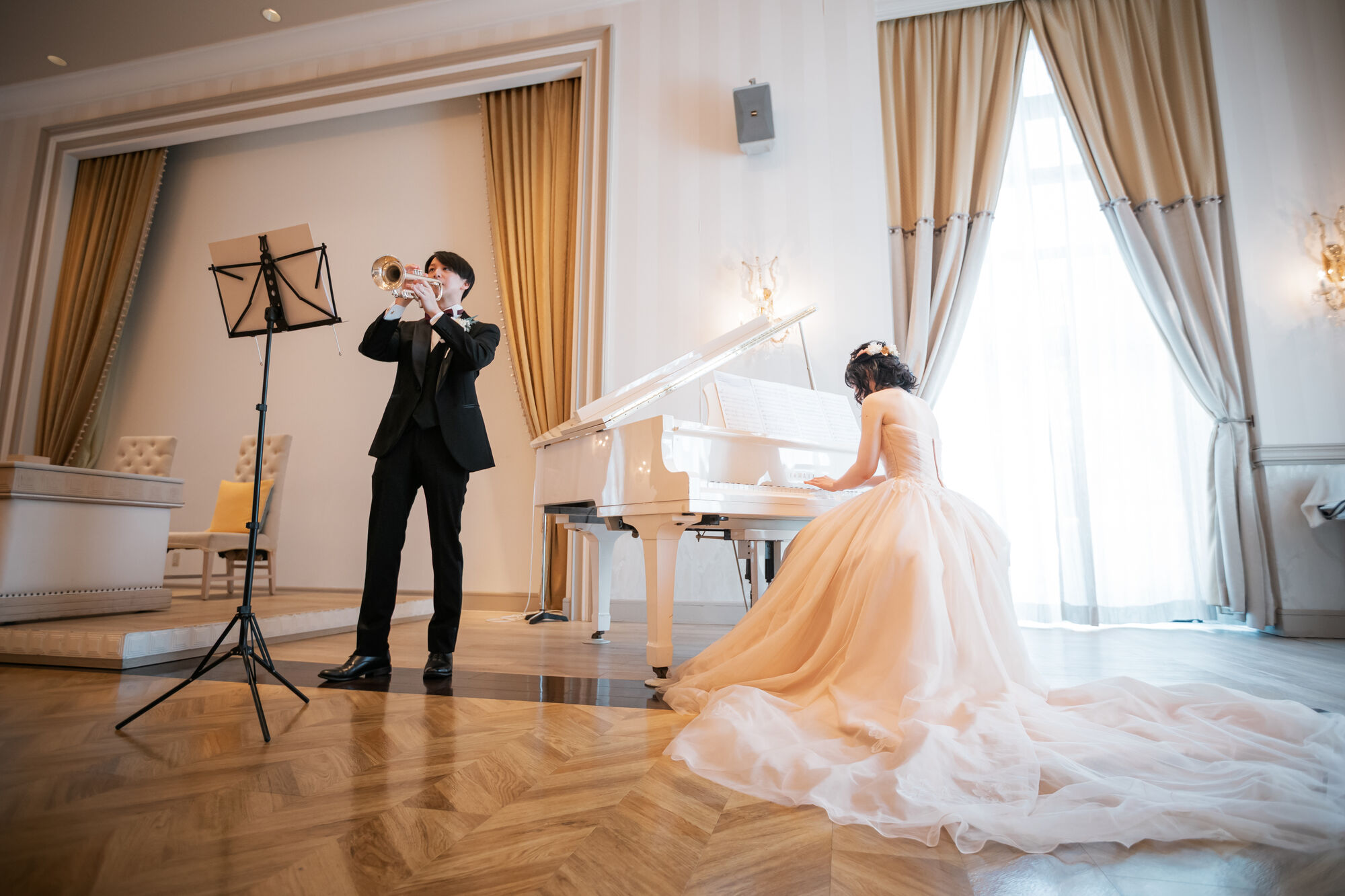 共通の趣味は演奏楽器。 おふたりで奏でる音楽には、息の合ったおふたりならではの温かさと優しさが感じられます。いつも自然と笑顔があふれ、柔らかな空気に包まれているおふたり。 結婚式に向けても、おふたりらしさを大切にしながら、一つひとつ想いを込めて丁寧に準備を進めてくださいました。