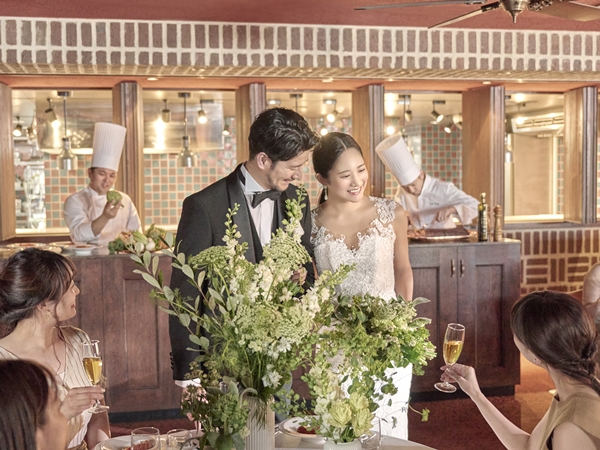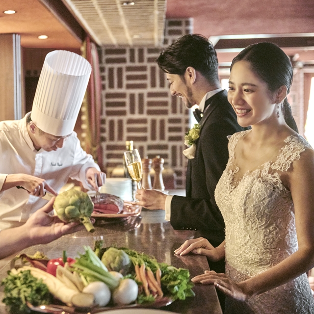 おもてなしの決め手は、「2017年オリコン日本顧客満足度調査 ハウスウエディング 料理」で1位に輝いた自慢の料理です。本格的なオープンキッチンを完備し、出来立てのベストなタイミングで皆さまにお召し上がりいただけます。美味しさはもちろん、香りや音、シェフのパフォーマンスなど、その場で作り上げるからこそ味わえるライブ感も、パーティーを盛り上げる演出となります。