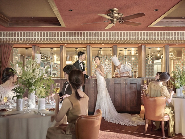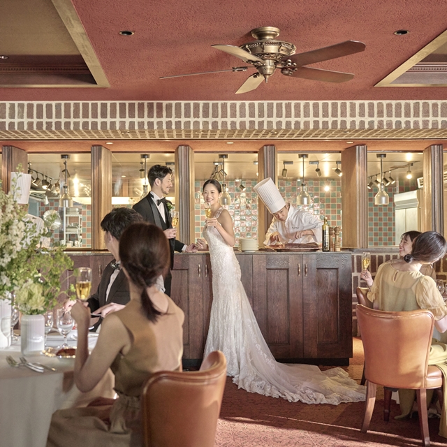 少人数でのパーティーにおすすめの「アヴァンザール」は、オープンキッチンのあるレストラン感覚のバンケット。レンガ造りの風合い豊かな空間に選りすぐりのインテリアを配し、ゲストも心躍るおしゃれなパーティーシーンを演出します。