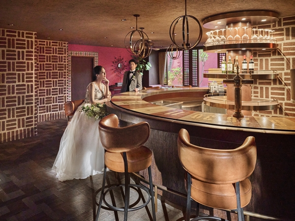 ゆとりあるフロア内には、色とりどりのドリンクを取り揃えたルーレットバーも。その周りにはお洒落なソファがぐるりと配置され、ウエルカムシーンから絵になるこだわりの空間です。ワンフロアの全てを貸切にして、おふたりらしいプライベート感あるパーティーを自由に叶えていただけます。