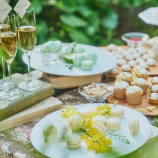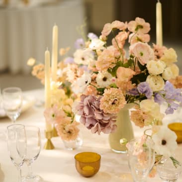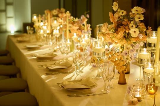 落ち着いた色調で統一された「ブリリアーム」は、どんなコーディネートも美しくマッチします。白とグリーンで上品にまとめたり、ピンクのお花でキュートに演出したりとアレンジは自由自在。お好みの色やテーマに合わせ、おふたりらしさあふれるパーティー空間が誕生します。