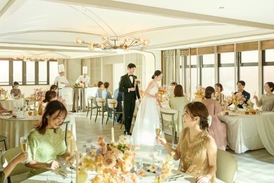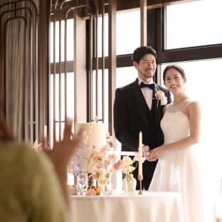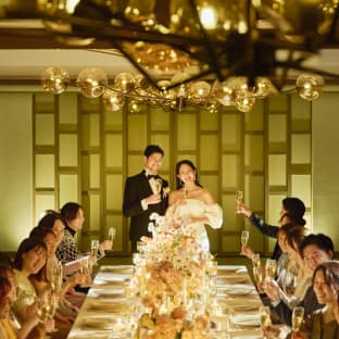 「ブリリアーム」では、ゲストと一緒に多彩な演出をお愉しみいただけます。例えば、プロジェクションマッピングやサプライズ入場を行えば、歓声が上がるワンシーンに。また、デザートビュッフェや高級感あふれるバーカウンターからオリジナルカクテルを振る舞ったり、会場の一角にフォトブースを作ってゲストと記念撮影をしたりと、おふたりらしい演出が叶います。
