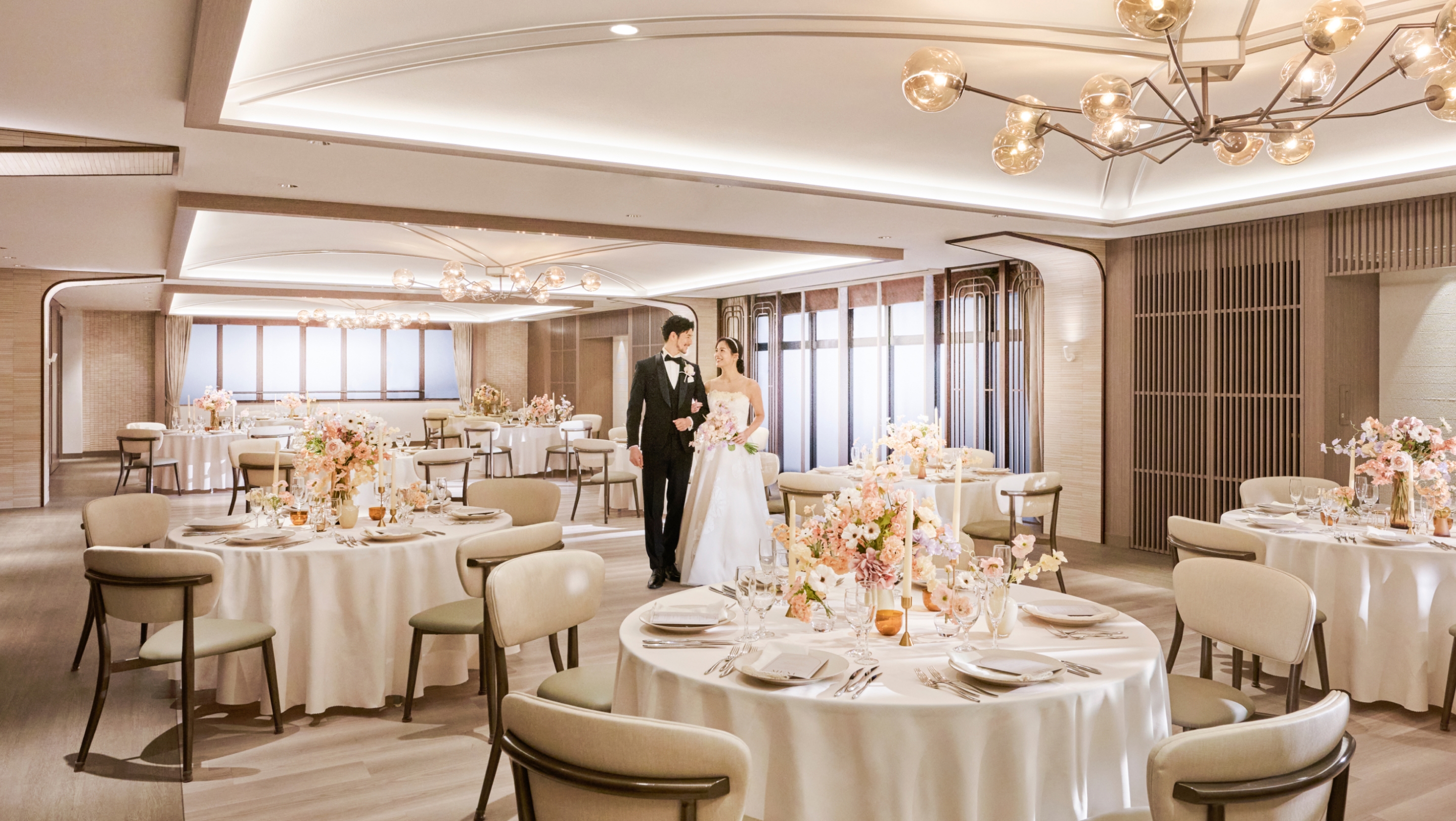 落ち着いた色調で統一された「ブリリアーム」は、自然体の笑顔あふれるパーティーが似合う上質なバンケット。すりガラスの窓から降り注ぐ柔らかな自然光に包まれた空間で、ぬくもりに満ちたパーティーをお愉しみいただけます。