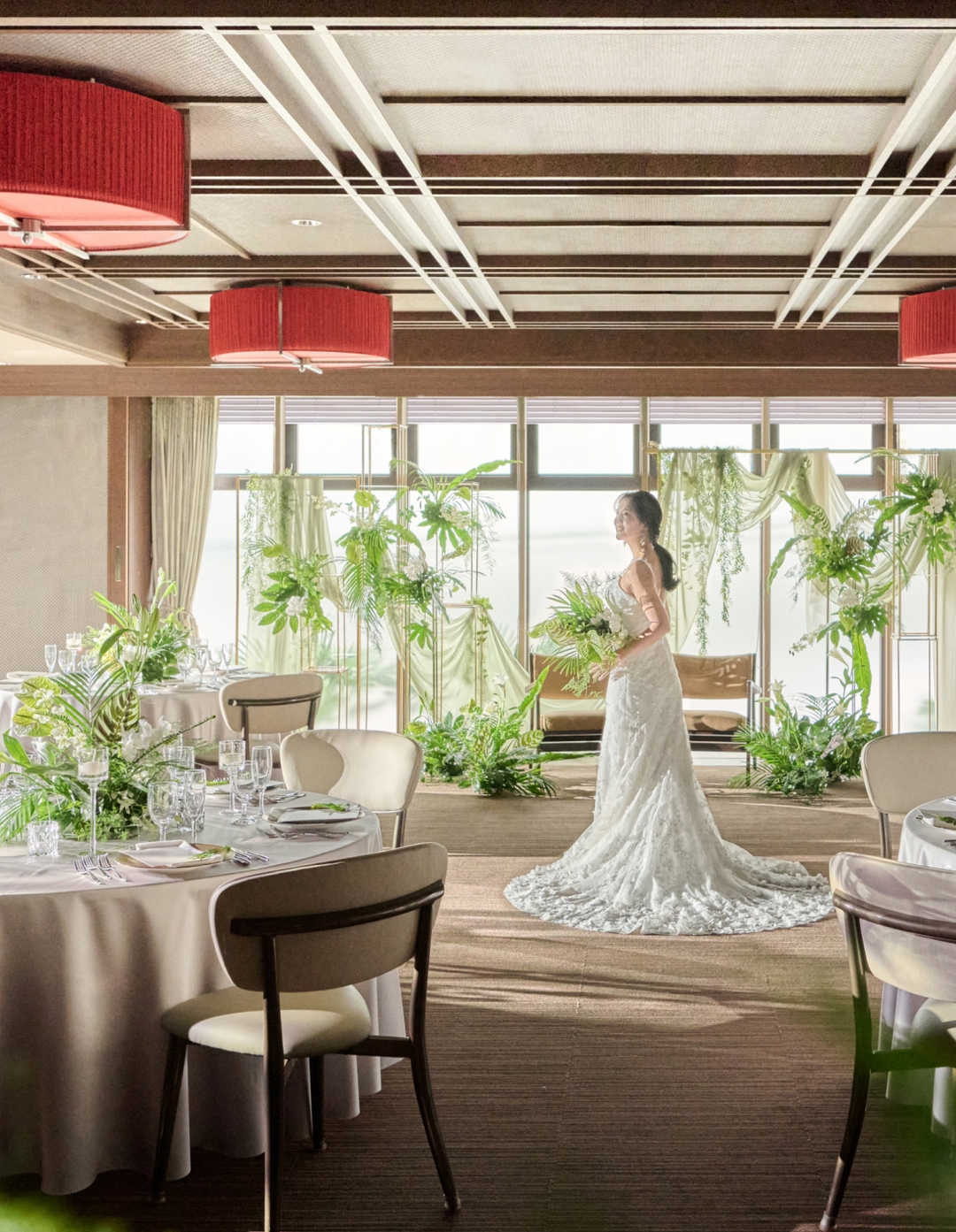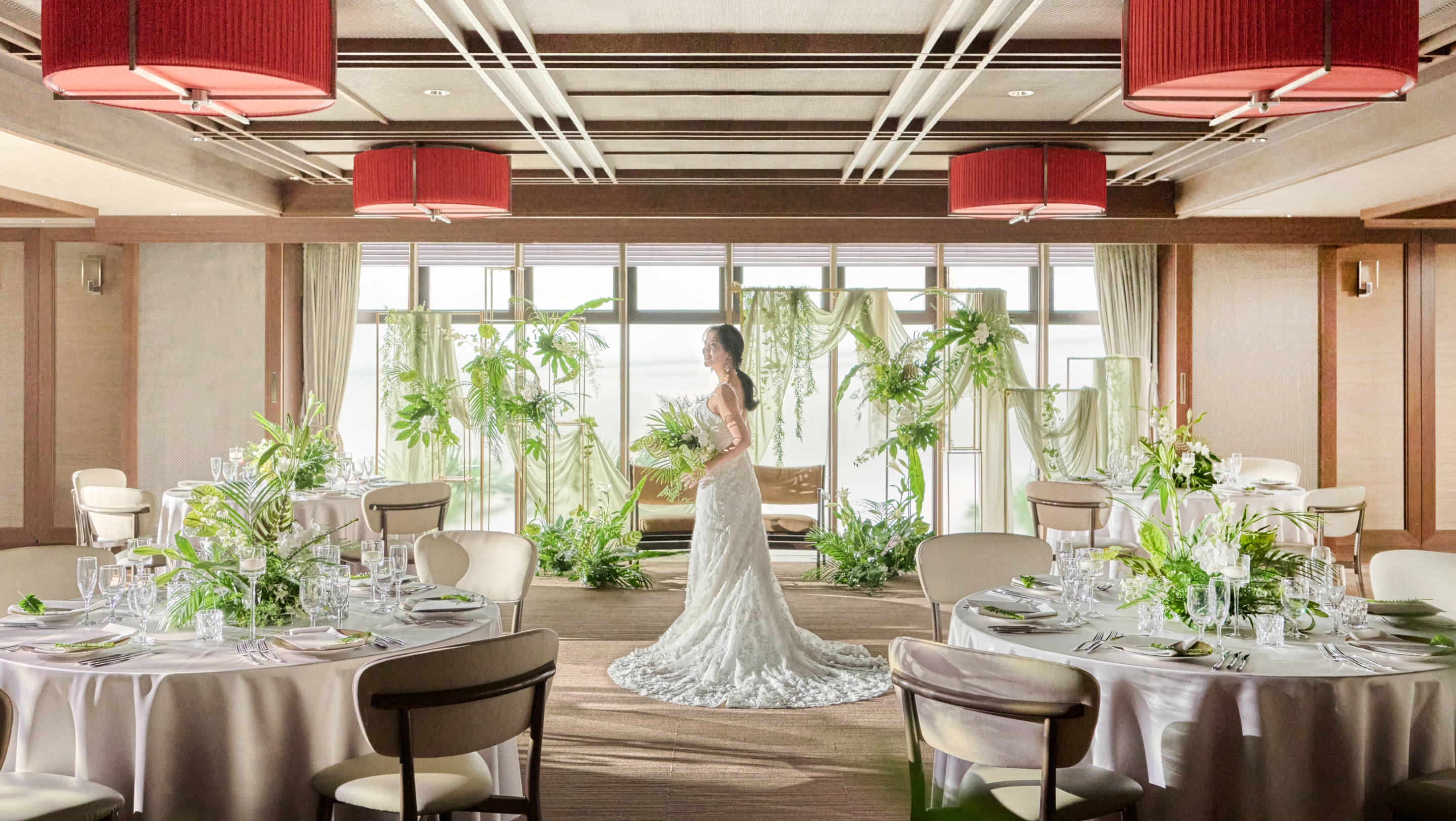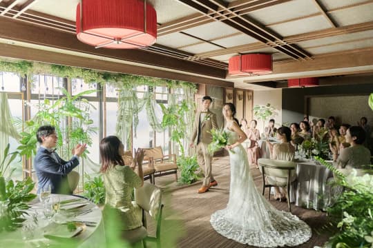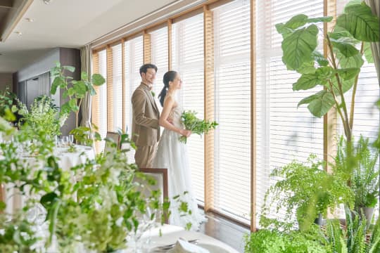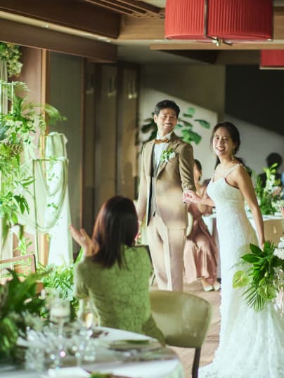 落ち着いたブラウンの木目に上品なオレンジの照明が華を添える「クレール」は、コーディネートによって表情が大きく変わる空間。華やかな洋風スタイルはもちろん、和のエッセンスを効かせたモダンなコーディネートも美しく調和します。お気に入りの花やテーマカラーで自由に飾り付けて、おふたりらしさを思い通りに表現していただけます。