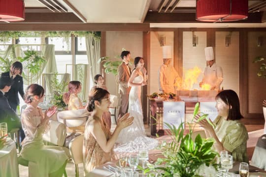 パーティー中にデザートビュッフェやバーカウンターからオリジナルドリンクを振る舞ったり、臨場感あふれる料理演出を愉しんだり、ワンフロア貸切ならではのプライベート感あふれる演出をお愉しみいただける空間をご用意。ゲスト専用フロアに加え、バンケットの手前にも広々としたラウンジもお使いいただけます。