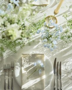 ナフキンとクロスはあえて同色のオフホワイトやクリーム色でまとめ、
