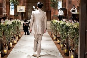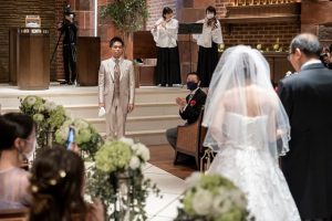 さっきまでの緊張が少し和らぎ、証人となるゲストのみなさまに「おめでとう」「頑張れよ!」と見守られながら新郎様が一歩一歩ずつ進みいただき、これから人生をともにする新婦様のご入場をお待ちいただきます