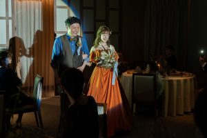 胸元のフリルと、通常よりも長く作られたスカート脇のラインが