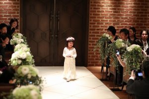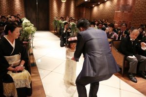 新婦様にリングピローを届けているのは、リングガールのお子様♡