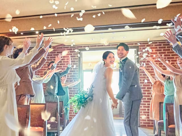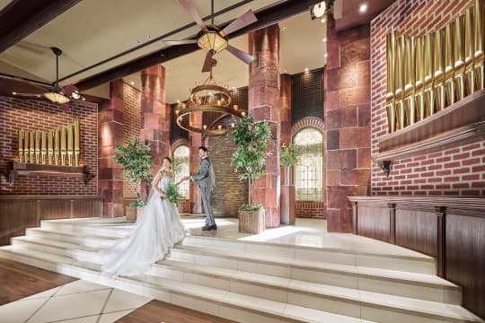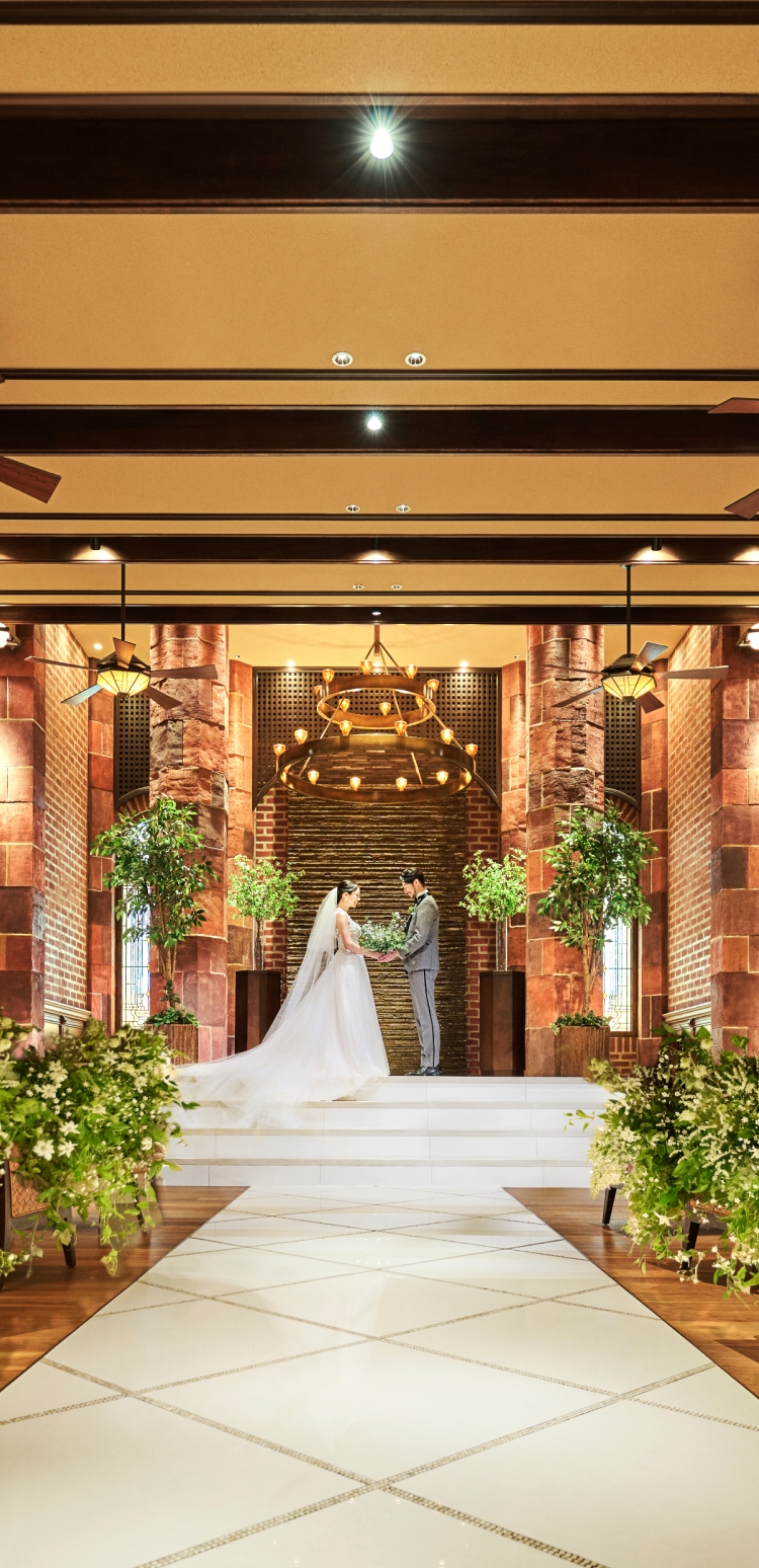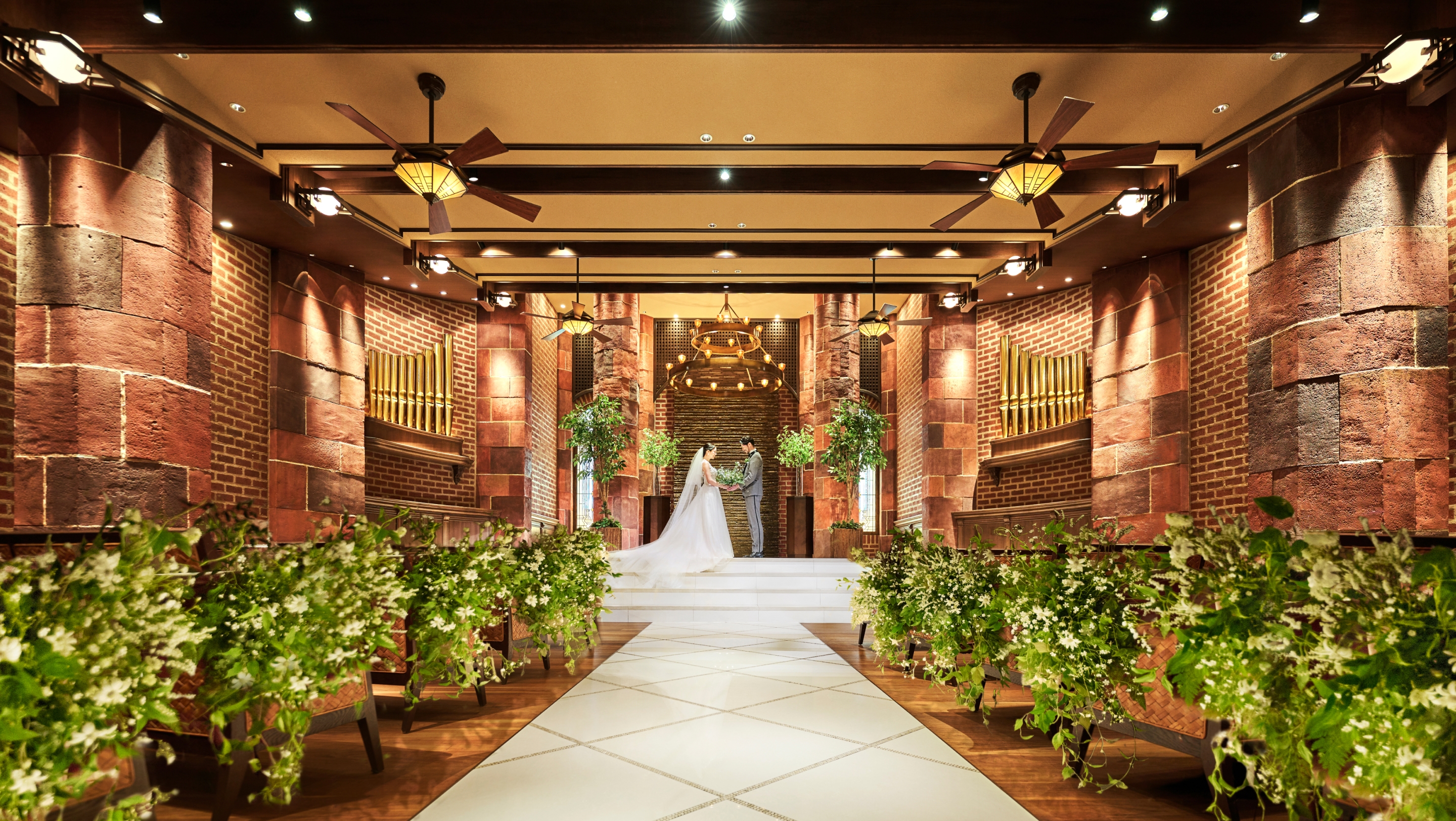 一歩足を踏み入れた瞬間に誰もが心奪われる、美しい赤レンガ造りのチャペル。 職人が一つひとつ手焼きした3万個のレンガを人の手で大切に積み上げた空間は、ほかにはない優しさと温もりに満ちています。おふたりとゲストとの距離を考えあえて横長に設計されたチャペルでは、一体感のあるアットホームな挙式を執り行っていただけます。