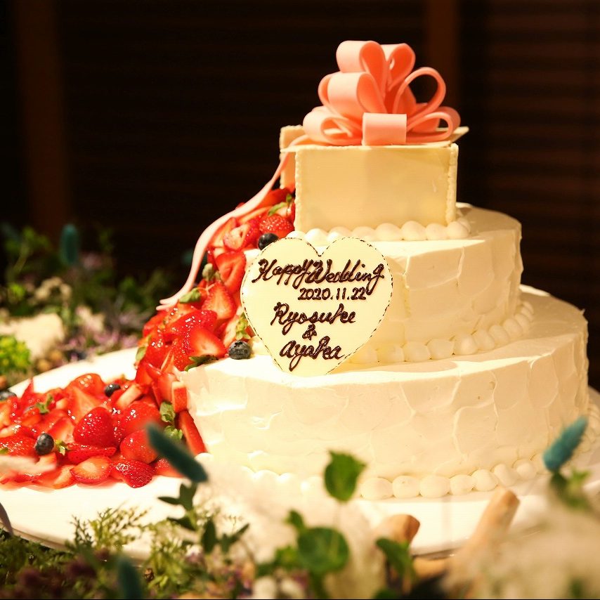 また、ウェディングケーキでは知り合いがやったことのないデザインにしたいという願いのもと、プレゼントボックスからイチゴが溢れ出るデザインにしました。見た目の可愛さに大満足でした。