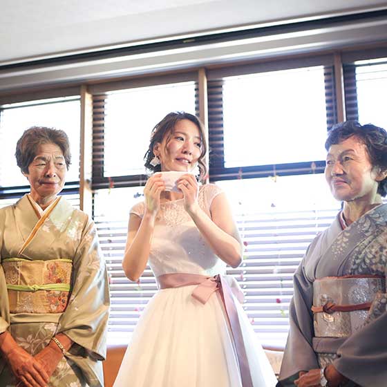 披露宴の中座の際は、サプライズで2人の祖母にエスコートをお願いしました。2人もびっくりし、そして喜んでくれて、とっても嬉しかったです。3人で手をつないで中座したのがいい思い出となりました。