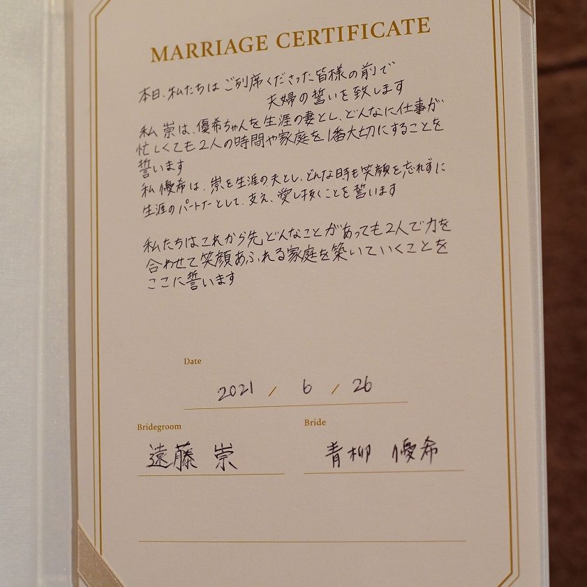 親族のみで人数が少なかったので、寂しいかなと思っていたのですが、家族みんなとっても暖かく祝福してくれて、すごく嬉しかったです。