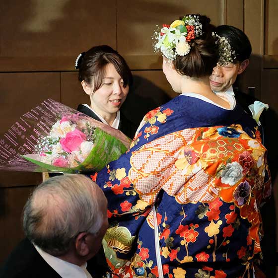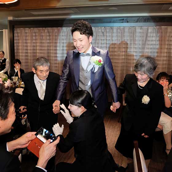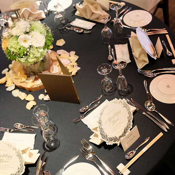私達は調理の専門学校を卒業して飲食業で働いていたので、ゲストに調理関係の方が多いこと、親族におお年寄りが多いことから見た目や味付け、ナイフやフォークではなく、お箸でお料理が食べられるかなど料理長やプランナーさんと打合せしたおかげでとても喜んでもらうことができました。