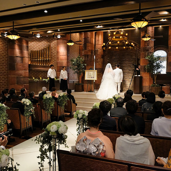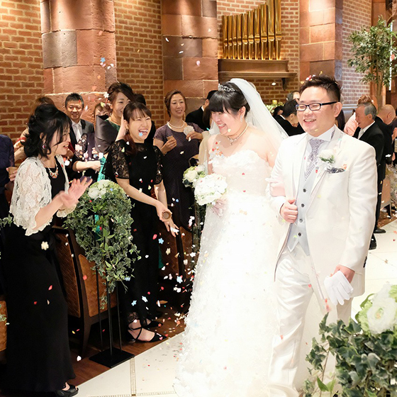 レンガの色が茶色のため純白のウェディングドレスがとてもキレイに見えることもどこにもないチャペルだからこそいいなぁと思いました。チャペルムービーも両親に感謝の気持ちを伝えるサプライズができて素敵だと思いました。