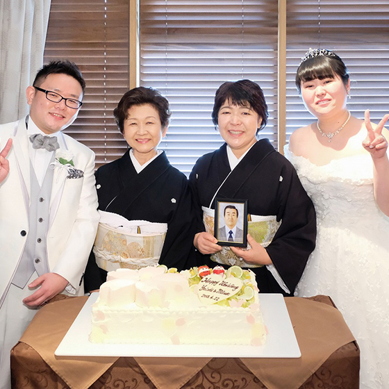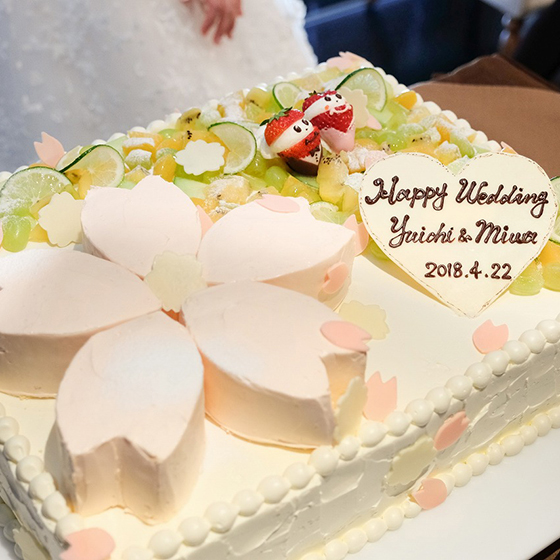 先ほどものべましたが、結婚式が春ということで、ケーキも春っぽくしたいと考えて、桜ケーキにしました。桜ケーキの隣にイチゴの新郎新婦が寄り添いあって飾られててとてもかわいいケーキになって嬉しかったです。そして、当日はこのかわいいケーキを子供達にケーキプレゼンターとして運んでもらいより可愛さがまし、特別なケーキになりました。