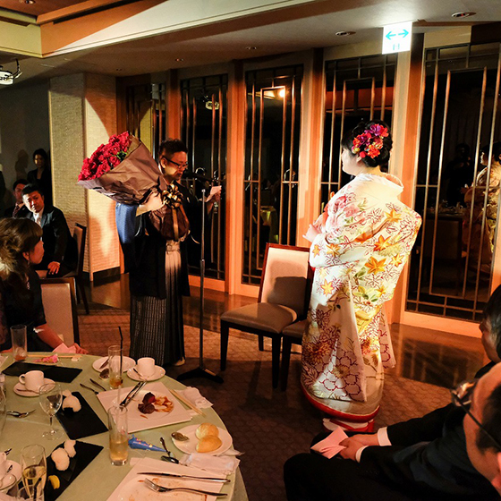 結婚式の前日ウェルカムスペースを飾りつけをしているときから緊張が徐々に高まり、夜もなかなか寝付けませんでした。いざ当日ドレス、タキシードに着替えると、緊張もありましたがわくわくしてきました。しかし挙式では緊張のあまり失敗してしまい笑い溢れる私たちらしい楽しい挙式になりました。アフターセレモニーのブーケトスではプチキャンディブーケを5つトスしみんなが楽しんでくれて嬉しかったです。披露宴ではゲストの皆さんと写真を撮ったりお話したりあっという間の時間でした。披露宴後半にはお互い内緒でサプライズを計画していて、新郎への誕生日サプライズはゲストの皆さんにも協力していただき、色紙を書いてもらってクラッカーでサプライズしました。新郎は友人と協力して余興で新婦の生い立ちの場所を巡ったムービーと108本の大きな薔薇の花束、そして手紙でサプライズしました。どちらも心に残る素敵なサプライズで感動しました。新婦友人の余興ではダンスをしてもらい場が盛り上がってとても楽しかったです。結婚式を終えて、ゲストの皆さんから「感動したよ」「良い結婚式だったね」等声をかけていただきフォーチュンインザテラスで結婚式を挙げられて本当に良かったと思いました。