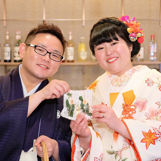 まず1つ目はお料理です。ゲストに美味しいお料理でおもてなしができたらいいなぁと以前から2人で考えていました。試食会後、シェフと納得行くまで話し合いをさせていただき、私たちの意見を取り入れてくれた料理にしてくれてとても嬉しかったです。また、県外から来てくださるゲストもいましたので、新潟の美味しいお米を食べてもらいたいと思い、[新潟県産コシヒカリのお結び]をメニューに入れました。とっても可愛かったです。そして結婚式が終わってから、「料理凄くおいしかったよ」と言ってもらえて素敵なおもてなしが出来たので嬉しかったです。